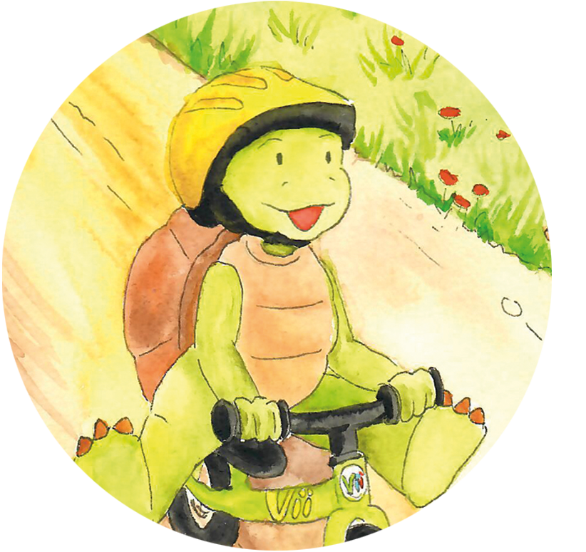 Ulli, die Schildkröte, der Jüngste in der Truppe fährt selbstbewusst auf seinem Laufrad durch die Gegend.